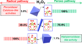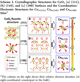 众所周知,多相催化不仅与反应物的吸附并且与其在催化剂表面活性位点上的活化密切相关。很多研究表明,改变CeO2暴露的晶面可以调节其表面化学性质,进而改变其在许多催化反应中的性能。因此,我们认为调控CeO2表面Ce位点的配位结构可以改变H2O2的活化路径,从而影响其在酶模拟反应中的选择性。研究表明,CeO2的三种不同晶面(111), (110)和(100)表面Ce位点的配位/电子结构均不相同,可以预期不同的Ce位点会以不同的方式吸附/活化H2O2,从而影响它们在多种酶模拟反应中的专一性。