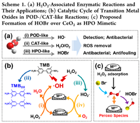 随着纳米科学的发展,一系列纳米材料被报道具有与天然酶相似的催化性质,这一类的纳米材料被称为“纳米酶(nanozyme)”。与天然酶相比,纳米酶作为酶的模拟物不仅拥有与天然酶类似的高催化性能,同时也具有催化活性可调、成本低廉、制备过程简单、容易回收、热和pH 稳定性卓越等优点。自2007年Gao 等人在Nat. Nanotechnol.首次报道Fe3O4纳米颗粒具有POD-like活性以来, 具有可变氧化价态的过渡金属氧化物(如V2O5, MnO2, Co3O4, Cu2O, CeO2等纳米颗粒)被报道不仅可以模拟过氧化物酶(POD),还可以模拟其他与H2O2相关的氧化还原酶,如过氧化氢酶(CAT)和卤过氧化物酶(HPO)。POD-like反应通常将H2O2转化为OH自由基,CAT-like反应将H2O2分解为H2O和O2。此外,HPO-like反应能催化H2O2氧化卤化物为次卤酸(例如,Br–转化为HOBr)。尽管这些酶模拟反应都有相应的应用,但一种材料的多种酶模拟反应会不可避免地竞争H2O2,影响其在目标应用中的性能和利用率。以CeO2为例,它的POD-like活性已被广泛应用于多种重要生物分子(例如,葡萄糖、胆固醇、谷胱甘肽等)的检测。然而,它的CAT-like活性会促进H2O2的分解,从而降低了生物分子检测的灵敏度。同样, CeO2的HPO-like反应具有的抗菌和抗污效果也会因其同时具有POD-/CAT-like反应而降低。