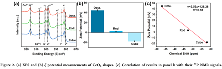 本文制备了三种不同形貌的CeO2纳米酶,包括具有(111)表面的八面体,具有(110)表面的棒状和具有(100)表面的立方体。尽管它们具有类似的Ce3d XPS能谱,但是它们的TMPO-31P核磁共振(31P-NMR)化学位移表明,不同形貌CeO2表面Ce位点的电子密度顺序为Ce6c(100)> Ce6c(110)> Ce7c(111)。此外,研究发现,不同形貌CeO2的ζ电位与它们的NMR信号有着很强的相关性。CeO2八面体的正ζ电位(+44.7 mV)可归因于其表面缺电子的Ce7c(111)位点,而立方体的负ζ电位(-17.7 mV)则是由于富电子的Ce6c(100)位点。