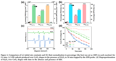 3,3’5,5′-四甲基联苯胺(TMB)和酚红(PR)作为指示剂分别用于POD-like和HPO-like反应活性研究。结果表明,CeO2立方体显示出最高的POD-like活性,其次是棒状和八面体。但有趣的是,对于HPO-like反应,它们的活性顺序则完全相反。CeO2八面体几乎没有POD-like活性,但却显示出最高的HPO-like活性;而具有最佳POD-like活性的CeO2立方体对HPO-like反应却几乎是惰性的。上述研究表明,CeO2八面体和立方体对HPO-like和 POD-like反应有着很强的专一性。
