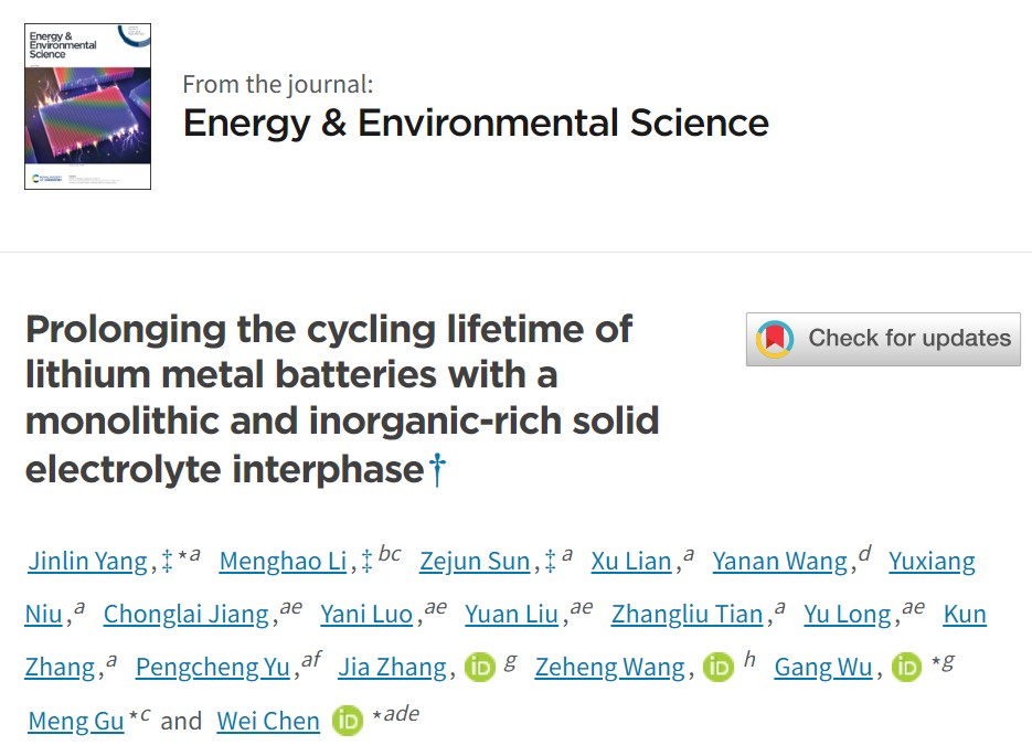 Prolonging the cycling lifetime of lithium metal batteries with a monolithic and inorganic-rich solid electrolyte interphase. (Energy & Environmental Science , DOI: DOI: 10.1039/d3ee00161j)
