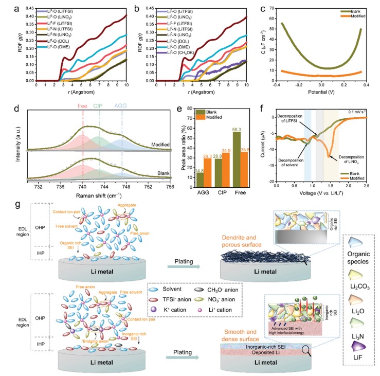 (a)-(b) 空白电解液和添加了0.04 M CH3OK的改良电解液中Li0-ODOL&DME、Li0-FTFSI–、Li0-OTFSI–、Li0-NTFSI、Li0-ONO3–、Li0-NNO3–和 Li0-OCH3–的MD获得RDF