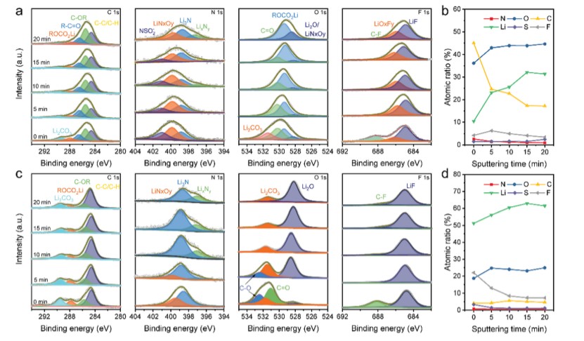 (d) 改性电解质中不同溅射时间SEI对应的原子比