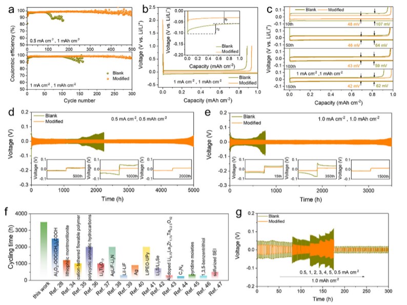 (a)-(b) 0.5 mA cm-2和1 mA cm-2的锂镀层/剥离库仑效率比较
