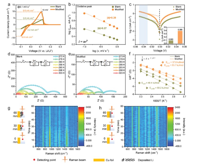 (g)-(h) 空白电解质和改性电解质的Li|Cu电池的原位拉曼光谱