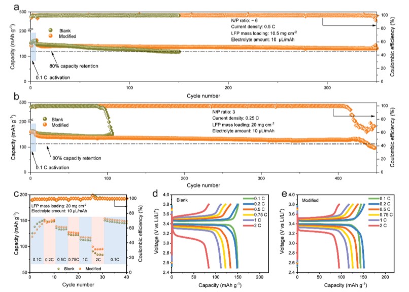 (c-e) LFP质量装载量为 20 mg cm-2的Li|LFP全电池在空白电解液和改性电解液中的速率性能和相应的充放电曲线