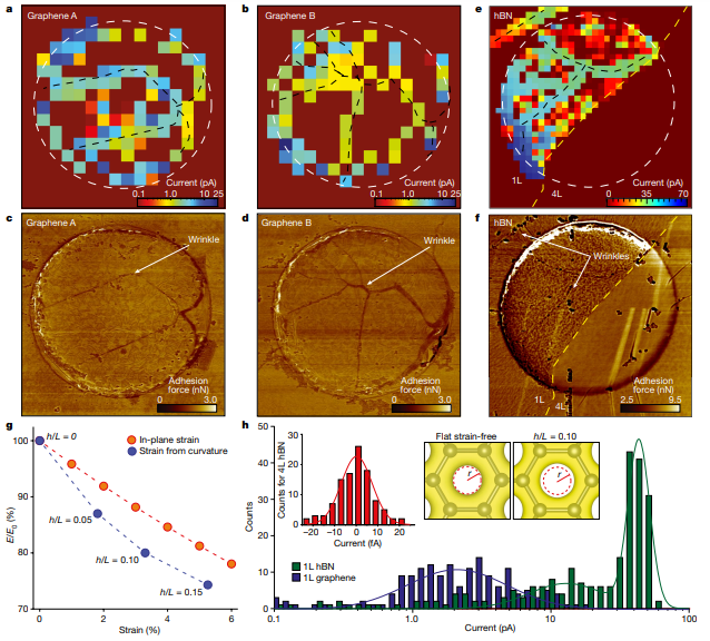 总之,本工作的实验表明,在没有缺陷的二维晶体中,应变诱导的形态特征与周围质子传导率的增强有关。一个值得注意的例子是石墨烯褶皱不需要任何晶格缺陷,但会导致高质子电流,这与CVD石墨烯中晶界的情况并不相同。本工作的研究结果还表明,在2D膜中普遍存在的纳米波纹会导致相当大的应变,加速质子在名义上平坦区域的传输。这一点很重要,因为石墨烯通常被建模为完美平整的无应变晶体。由于二维薄膜中的应变和曲率通常可高达10%,理论预测平板无应变石墨烯的E0高达1.5 eV,这与实验报道的势垒约为1.0 eV是一致的。最后,应变和曲率可以用来增强二维晶体的质子传导性,这对于涉及质子传输的各种应用是有意义的。