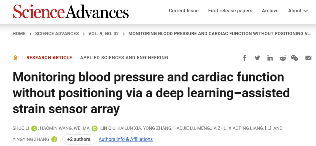 文献链接:Shuo Li et al., Monitoring blood pressure and cardiac function without positioning via a deep learning–assisted strain sensor array. Sci. Adv. (2023).