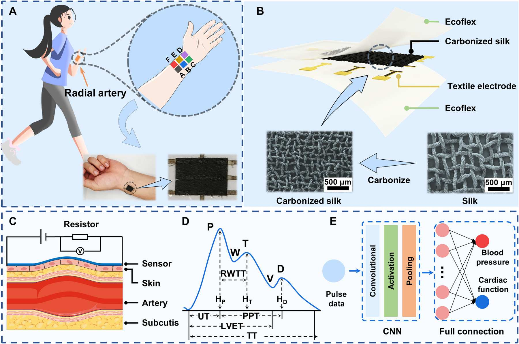 清华大学化学系张莹莹团队结合高灵敏度的应变传感器阵列和深度学习神经网络,开发了可穿戴、用户友好、智能的健康监测系统,无需精确定位和专业知识即可监测血压和心脏功能。以碳化丝织物(CSG)作为活性层材料,构建了柔性可穿戴应变传感器阵列。整个传感器阵列表现出优异的柔韧性、良好的生物相容性以及较高的结构和化学稳定性。构建了一个集成的可穿戴系统,并展示了其在精确和实时监测血压和心脏状态方面的应用。相关研究成果以“Monitoring blood pressure and cardiac function without positioning via a deep learning–assisted strain sensor array”发表在Science Advances上。