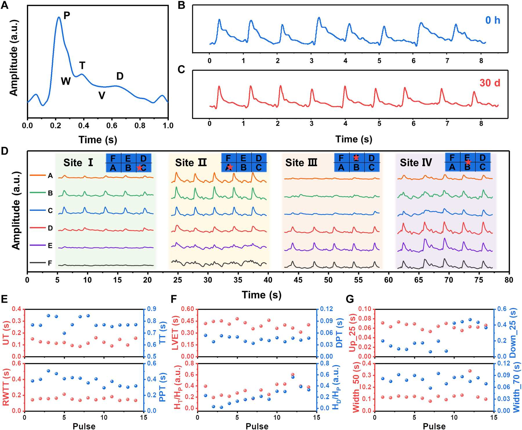 图3 应变传感器阵列在获取脉冲波和提取关键特征方面的性能。@2023 The Authors