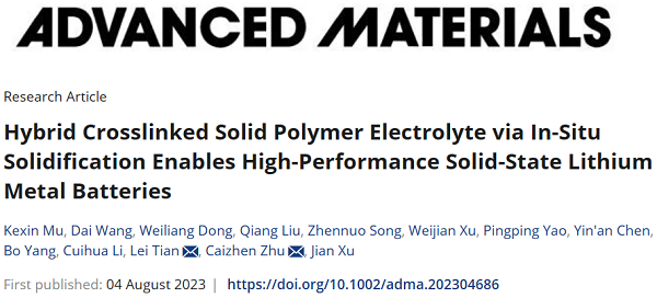 原文详情:Hybrid Crosslinked Solid Polymer Electrolyte via In-Situ Solidification Enables High-Performance Solid-State Lithium Metal Batteries (Adv. Mater. 2023, 2304686)
