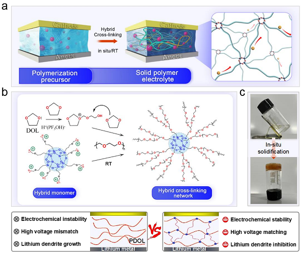 (a)通过室温原位聚合的混合交联固态聚合物电解质设计原理的示意图。