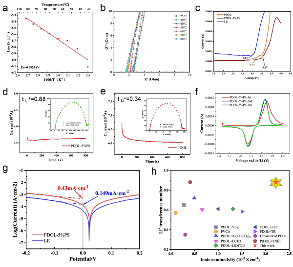 (g)使用PDOL-5%PS-HCPE和LE组装的锂电池的Tafel图。