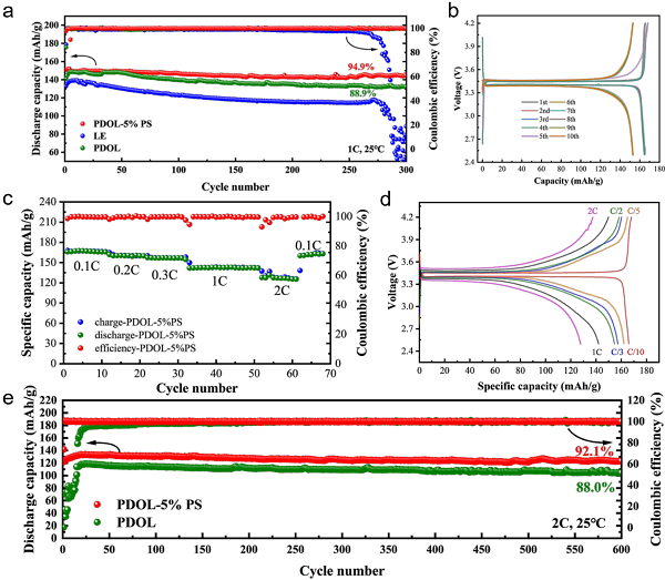 (e)在25℃时,Li|PDOL-5%PS|LFP和Li|PDOL|LFP电池以2C的倍率进行长周期稳定性。