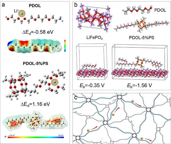 (b)PDOL和PDOL-5% PS与LiFePO4的结合能和优化的几何结构。