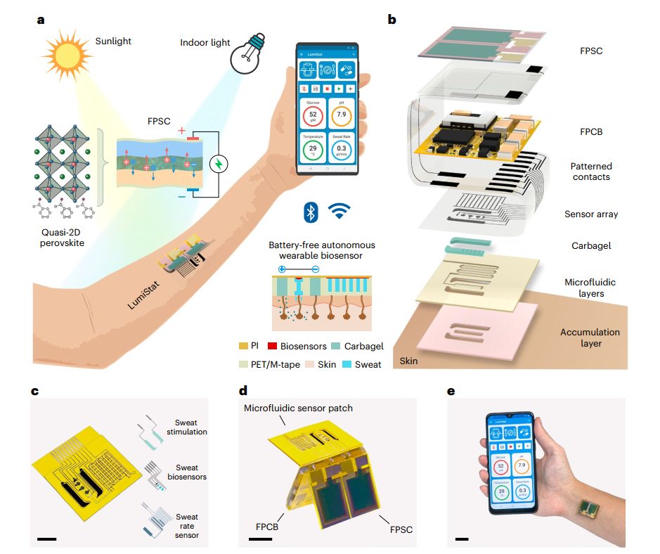 这项研究了报道一款由钙钛矿太阳能电池供电的自主可穿戴生物传感器,能持续非侵入性地监测代谢情况,实现了室内外活动中多种生物化学数据的连续采集。