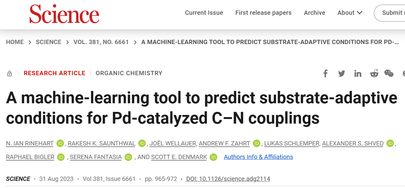 近期,美国伊利诺伊大学厄巴纳-香槟分校的Scott E. Denmark教授以及瑞士巴塞尔合成分子技术开发过程化学和催化制药部的Raphael Bigler和Serena Fantasia等人提出了一种工具,给出了钯(Pd)催化碳氮(C-N)偶联的底物自适应条件预测。该工具的设计和构建需要生成一个实验数据集,该数据集可以在一系列反应条件下探索不同的反应物配对网络。通过系统的实验设计过程,利用神经网络模型主动学习大范围的碳氮偶联。模型在实验验证中表现出良好的性能:从一系列与样品外反应物的偶联中分离出10个产品,产率超过85%。重要的是,随着数据量的增长,所开发的工作流程不断提高工具的预测能力。相关研究成果以“A machine-learning tool to predict substrate-adaptive conditions for Pd-catalyzed C–N couplings”为题发表在国际著名期刊Science上。