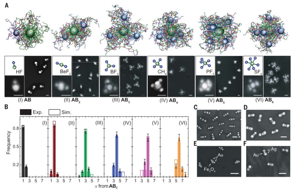 图十 对胶体分子形成的实验以及模拟研究(Science 2020,369,1369-1374)。