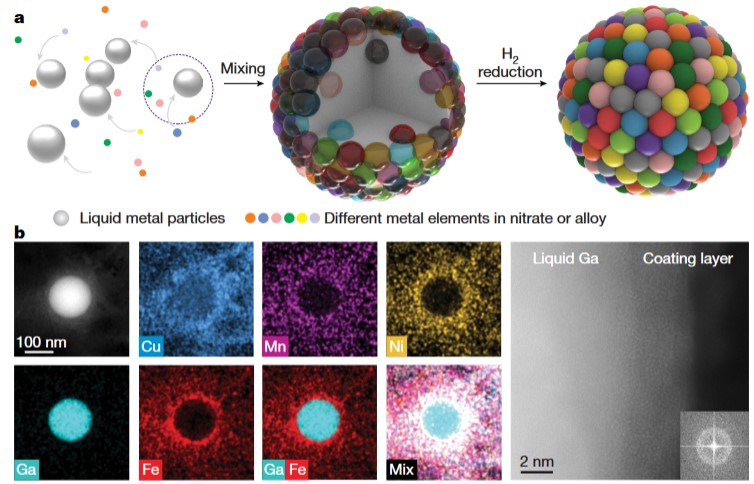 图五 液态金属参与合成的高熵合金纳米颗粒(Nature 2023,619,73–77)。