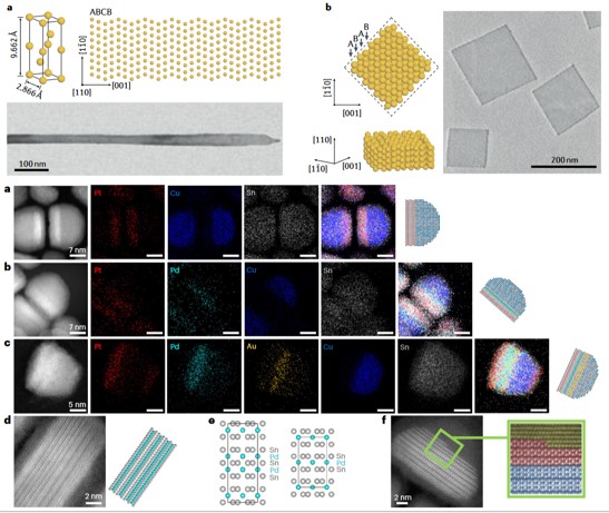 图八 4H Au纳米带(Nat. Commun. 2015, 6, 7684); 2H Au纳米片(Nat. Commun. 2011, 2, 292); 以及异质结构的金属间纳米材料(Nat. Syn. 2023,2,749–756)。