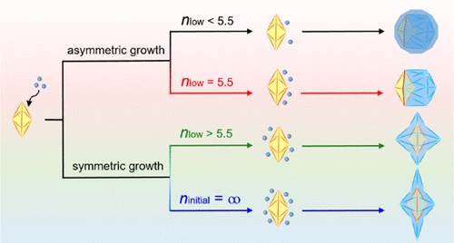 图一 动力学控制的两种在Pd十面体上生长Au的模式(J. Am. Chem. Soc. 2023, 145, 13400)。