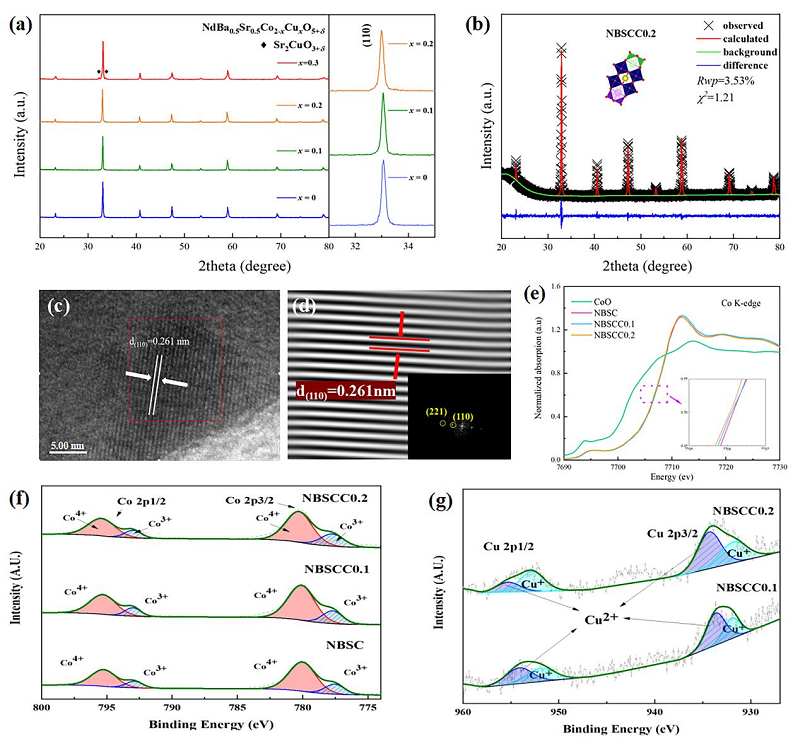 图1 (a)NBSCC的XRD图;(b)NBSCC0.2的XRD精修图;(c)NBSCC0.2的HR-TEM图;(d)NBSCC0.2(110)晶面上的傅里叶变换和逆傅里叶变换图;(e)Co-K边XANES谱;(f)Co2p和(g)Cu2p的XPS图。