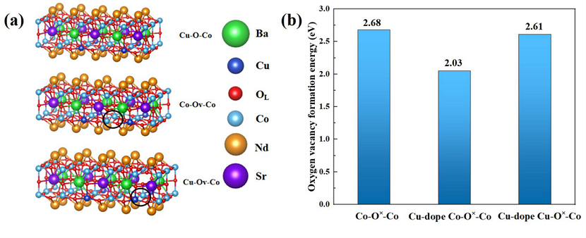 通过密度泛函理论(DFT)的计算,从理论上探究Cu的引入对氧空位生成的影响。计算结果表明,Cu掺杂的NBSCC0.2中氧空位的生成能小于未掺杂NBSC材料中Co-O×-Co的EV (2.68 eV)。表明Cu的掺杂有利于氧空位的产生。
