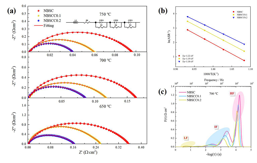 图4 (a)650-750°C下的EIS图;(b)Arrhenius拟合图;(c)700 °C下的DRT曲线。