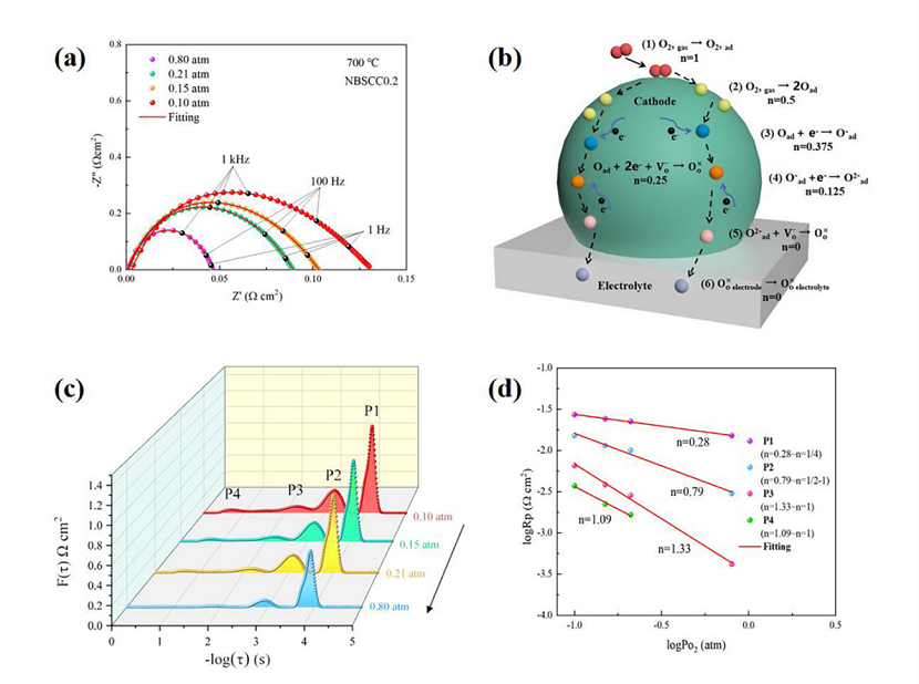图5(a)NBSCC0.2在700 °C不同氧分压下的EIS图;(b)阴极上的ORR过程示意图;(c)DRT图;(d)NBSCC0.2的Rp与PO2的关系图。