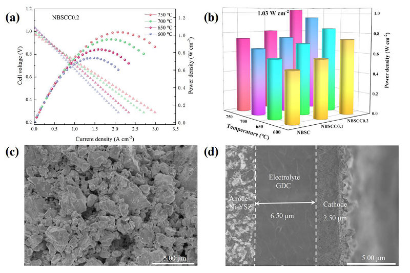 最后,以NBSCC系列材料为阴极,组装成全电池进行了输出性能的测试(图7)。750 ℃时,NBSCC0.2的最大功率密度(MPD)为1035 mW cm-2,比未进行Cu掺杂的NBSC高40%。
