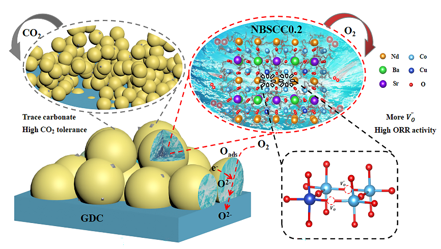 图8 Cu掺杂NBSC提升其ORR催化活性和CO2耐受性的机理图。