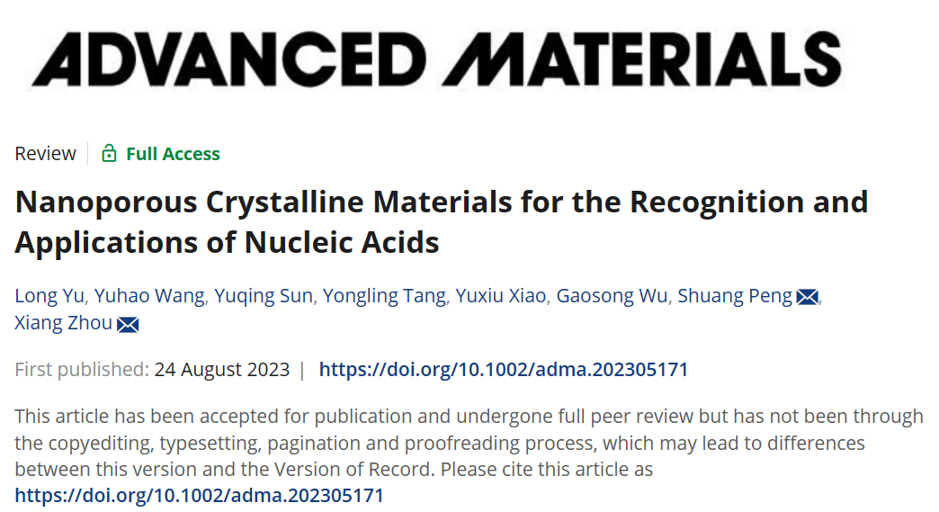 武汉大学化学与分子科学学院周翔院士团队综述了金属有机框架(MOFs)、共轭有机框架(COFs)和超分子有机框架(SOFs)三种纳米孔晶体材料用于核酸识别的最新研究进展。探索了使三种纳米孔晶体材料功能化的不同策略,以特异性地识别核酸靶标。重点介绍了它们在核酸选择性分离和检测中的应用,此外还有DNA/RNA传感器、基因递送剂、宿主DNAzymes和基于DNA的计算,以及包括催化、数据存储和仿生学的应用。新型纳米多孔晶体材料的发展,增强了生物相容性,为核酸分析和治疗领域开辟了新的途径,为开发具有广泛应用价值的敏感、选择性和成本效益的诊断和治疗工具铺平了道路。相关成果以“Nanoporous Crystalline Materials for the Recognition and Applications of Nucleic Acids”为题发表在国际著名期刊Advanced Materials上。