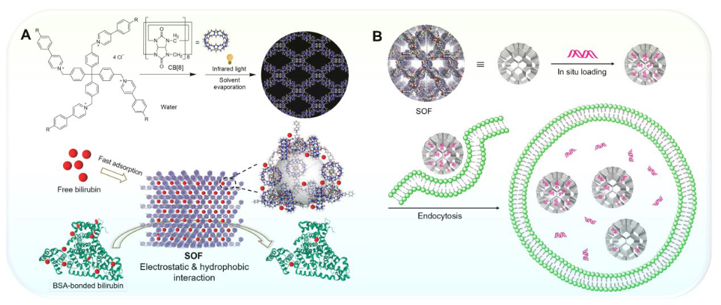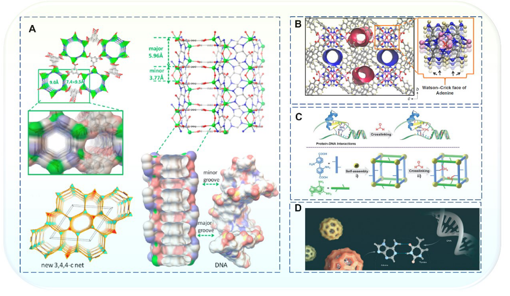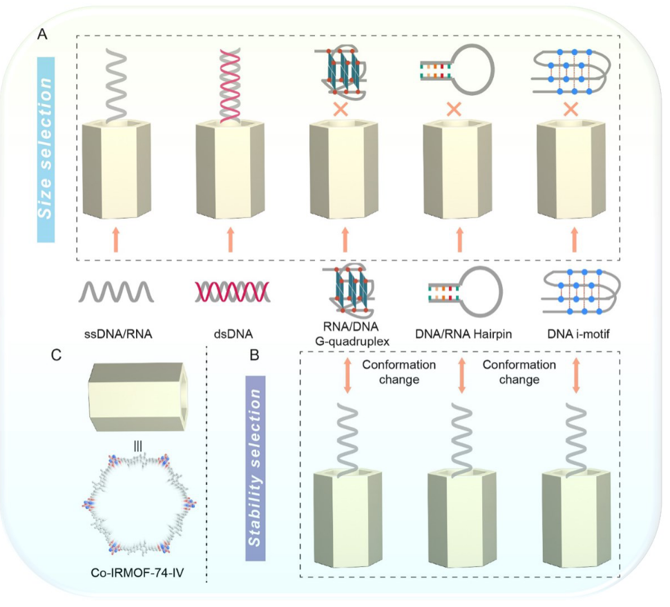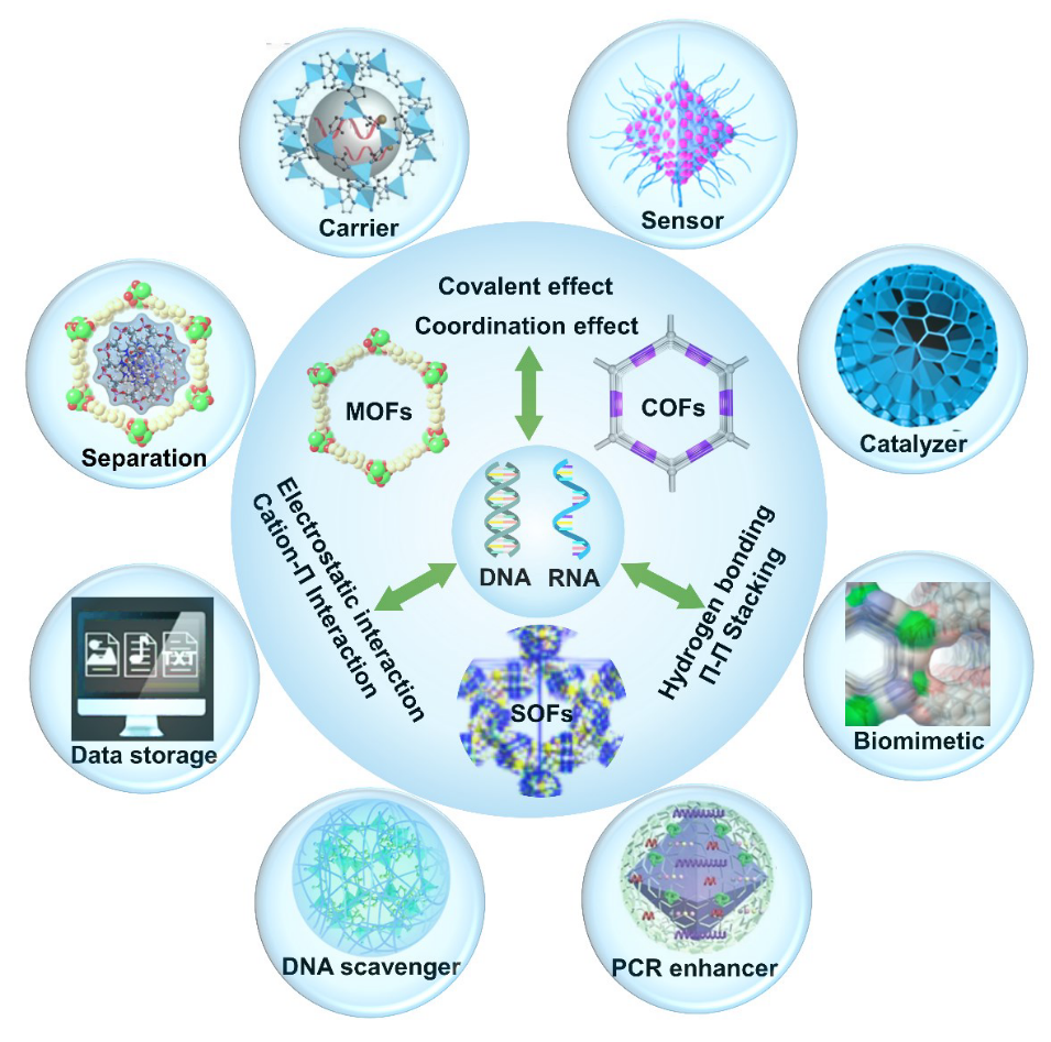 核酸,包括DNA和RNA,是所有生物遗传物质中的关键分子,在遗传信息的储存、传递和表达中起着重要作用。核酸识别在生物技术、诊断和治疗中起着至关重要的作用。因此,识别和操作核酸的能力对于科学和医学的各种应用至关重要。MOFs(金属有机框架)、COFs(共轭有机框架)、超分子有机框架(SOFs)具有高度有序的多孔结构、可调节的孔径和较大的比表面积,这些结构赋予它们吸附、荧光猝灭/发射和电催化等方面显著的优势。纳米多孔晶体材料作为核酸识别和应用的有效平台具有巨大的潜力。这些材料具有高度有序和均匀的孔隙结构,以及可调节的表面化学和孔径,使其成为核酸提取、检测和递送的良好载体。