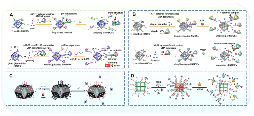 图3 核酸功能化纳米MOFs作为药物控释刺激反应载体的加载和门控原理图© 2023 Wiley