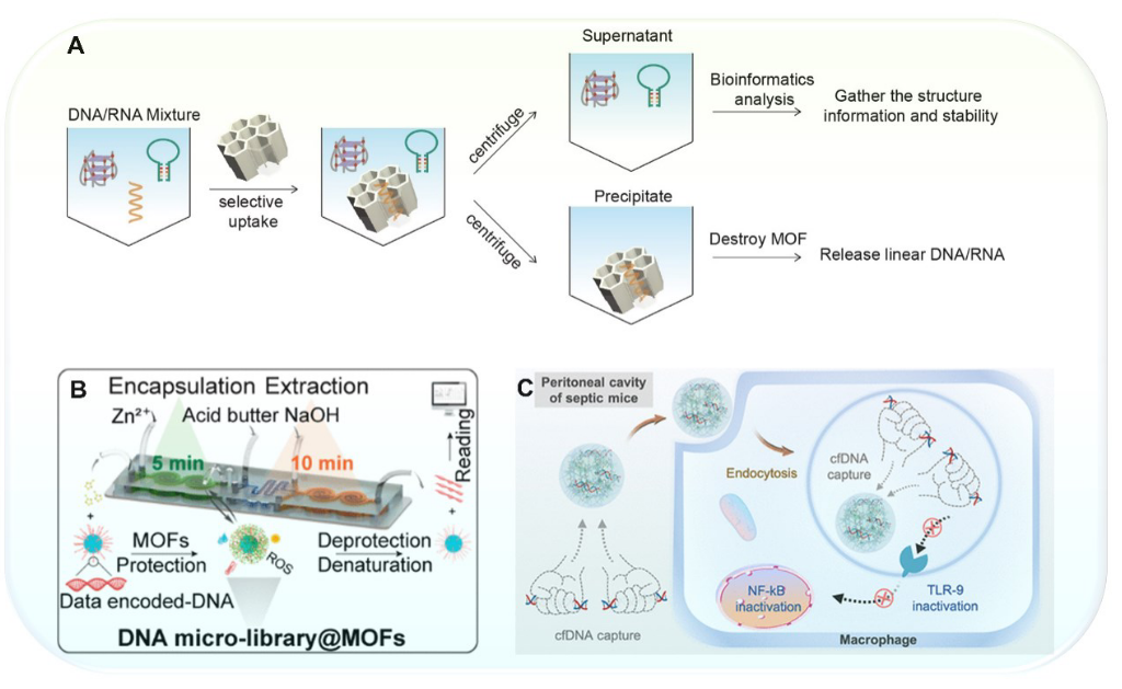 图5 MOFs在分离、数据存储和DNA清除中的应用© 2023 Wiley