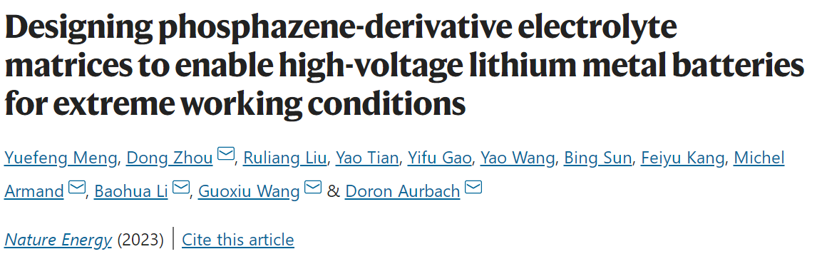 原文详情:Meng, Y., Zhou, D., Liu, R. et al. Designing phosphazene-derivative electrolyte matrices to enable high-voltage lithium metal batteries for extreme working conditions. Nat Energy (2023). https://doi.org/10.1038/s41560-023-01339-z