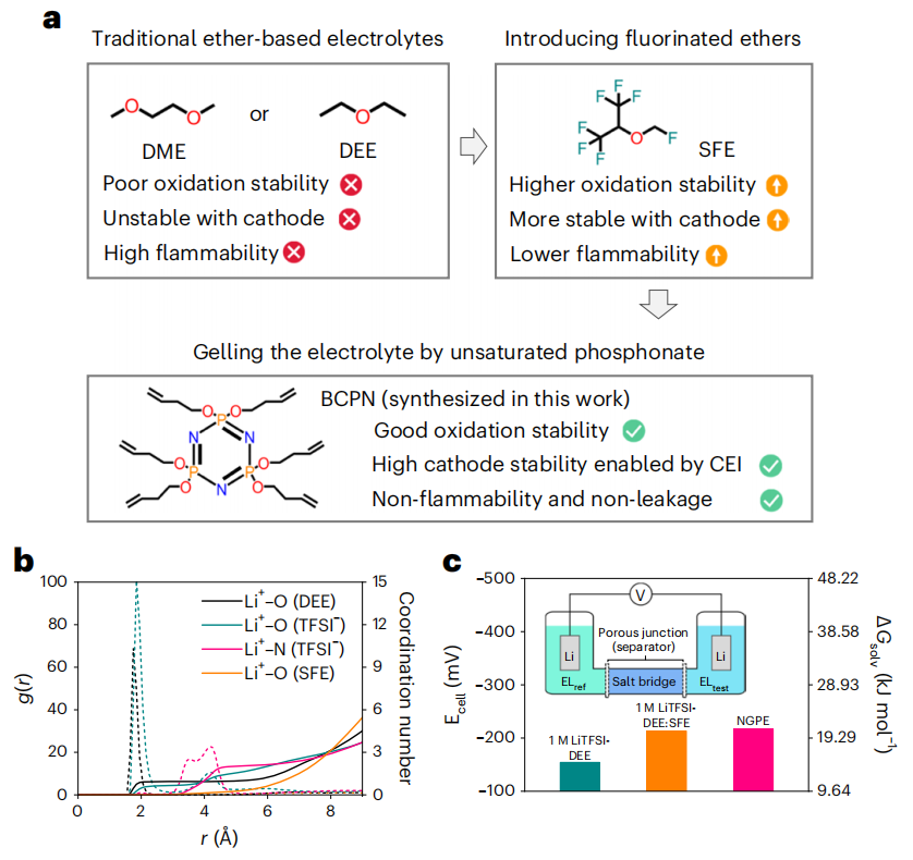 图1 NGPE的设计及溶剂化结构的研究。a, 醚基电解质的重新设计原则,用于高压和高安全性锂金属电池。 b, 从MD模拟中获得的NGPE的Li+径向分布函数g(r)。c, 测量得到的1 M LiTFSI-DEE、1 M LiTFSI-DEE:SFE电解质和NGPE的电池电位和溶剂化能。测试电池的示意图如插图所示。© 2023 Springer Nature