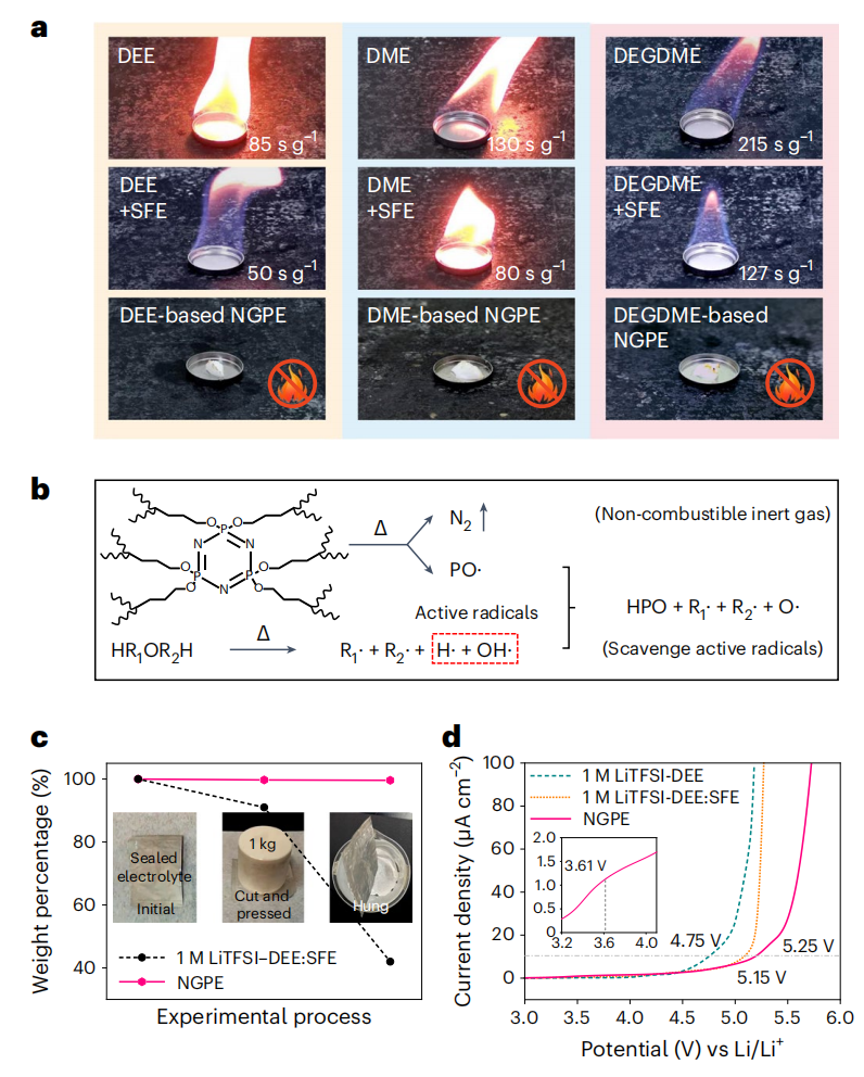 图2 NGPE的安全性。a, 三种醚类、醚类与SFE的混合物以及相应的NGPE的燃烧测试。 b, NGPE的可能阻燃机制。c, 对1M LiTFSI-DEE:SFE液态电解质和NGPE进行泄漏测试。d, 在5mV/s的扫描速率下,使用铂箔作为工作电极,锂箔作为对比和参考电极,测得1M LiTFSI-DEE、1M LiTFSI-DEE:SFE电解质和NGPE的LSV曲线。© 2023 Springer Nature