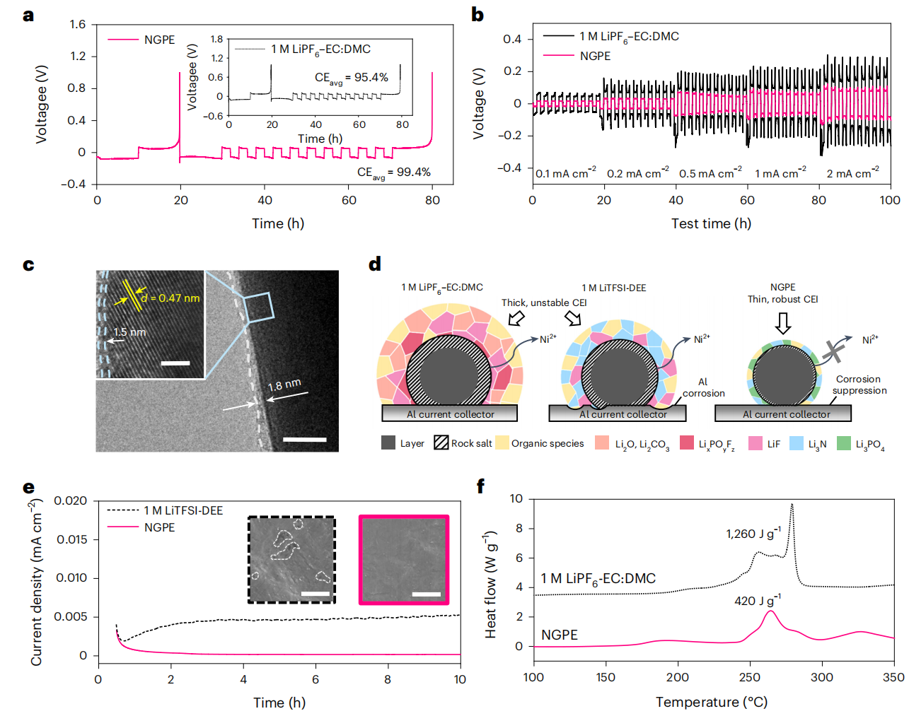 图3 NGPE与电极的界面相容性。a, Li离子电镀–剥离的CE。b,不同倍率下Li | | Li对称电池的电压曲线。c,在0.5C下经过十个循环后从Li | NGPE | NCM811电池中获得的NCM811正极的TEM图像。d, 1M LiPF6-EC:DMC,1M LiTFSI-DEE和NGPE中NCM811正极 | 电解质界面和铝集流体的腐蚀行为的示意图。e,在不同电解质中,将Al | | Li纽扣电池在4.4V下保持10小时的恒定安培法图。图中显示了1M LiTFSI-DEE和NGPE中经过恒定安培法测试后的Al箔的FE-SEM图像。f,通过DSC测量,不同电解液下完全充电的NCM811正极的热量产生情况。© 2023 Springer Nature