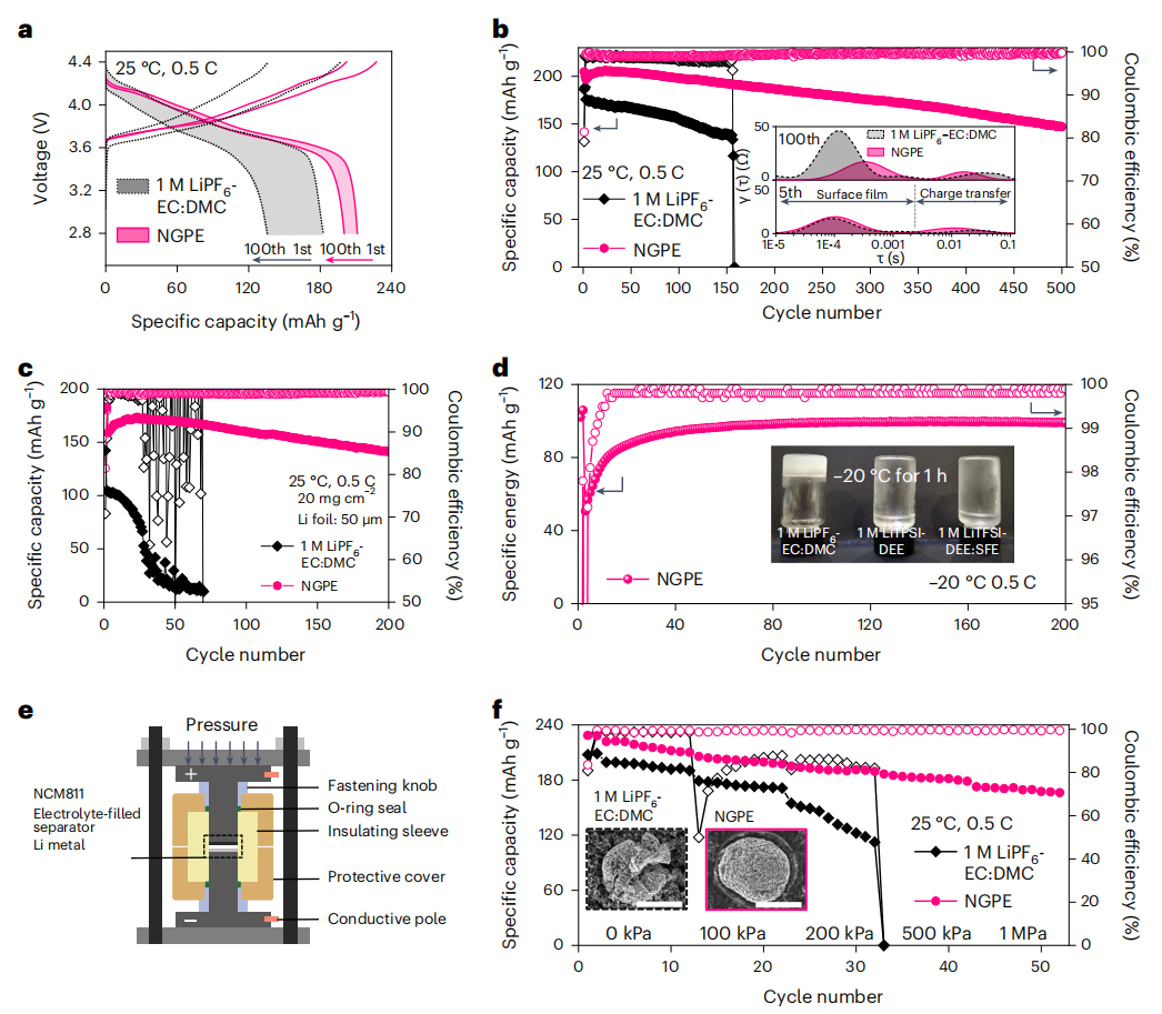 图4 Li| NGPE | NCM811纽扣电池在极端工作环境下的性能。a, b,1M LiPF6-EC:DMC电解液和NGPE的充放电电压曲线(a),以及0.5 C下Li | | NCM811电池的循环性能(b)。c, d,在25°C (c)和-20°C (d)下,具有高负载 (~20 mg cm−2) NCM811正极(电解质/容量比:~6.5 g Ah−1)和50 μm锂负极的Li | NGPE | NCM811电池的长期循环性能。插图显示了在-20°C下不同电解液的视觉观察结果。e,监测在Li | NGPE | NCM811电池循环过程中施加的堆叠压力的支架的示意图。f,堆叠压力对Li | | NCM811电池(负载:3 mg cm−2,锂箔:50 μm,电解质含量:60 μl)循环稳定性的影响。© 2023 Springer Nature
