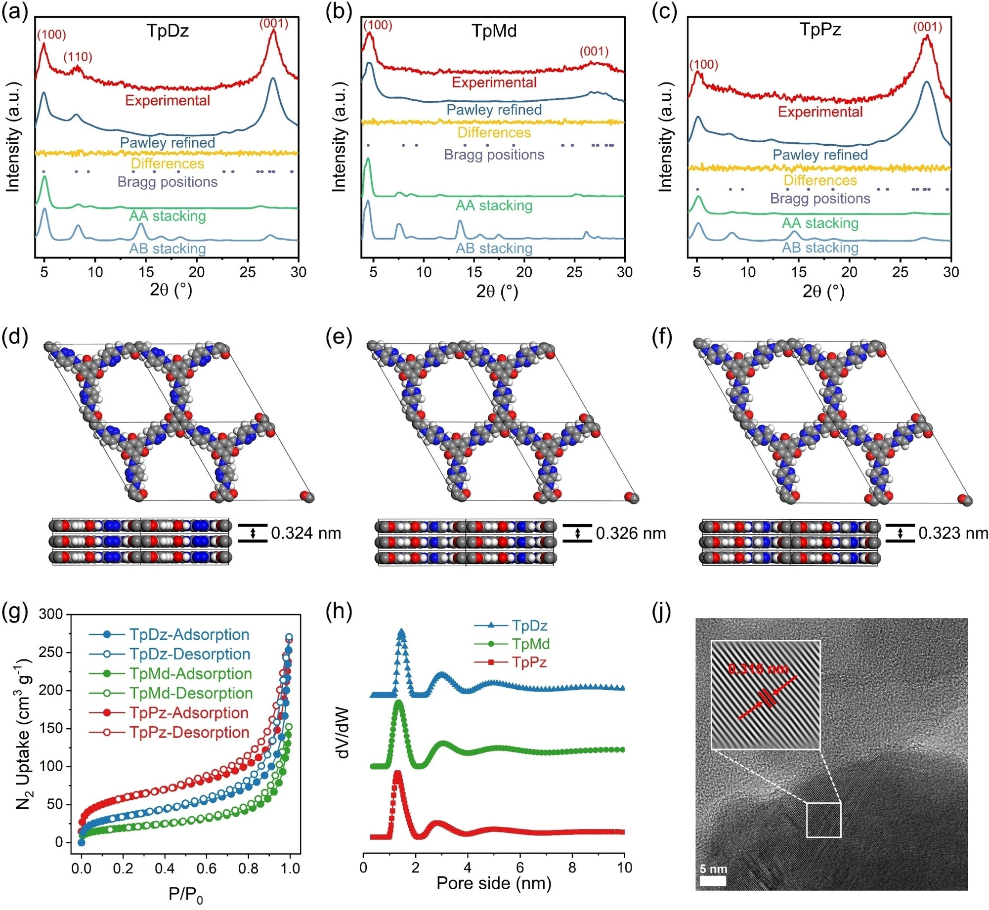 (a-c)TpDz、TpMd和TpPz AA堆叠模式和AB堆叠模式下的模拟PXRD图。