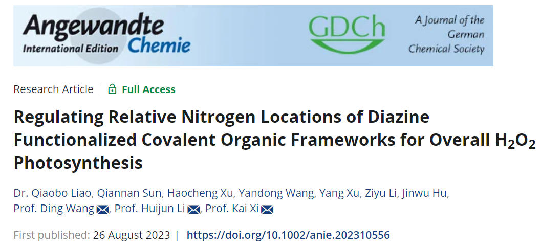 原文详情:Liao, Qiaobo, et al. Regulating relative nitrogen locations of diazine functionalized covalent organic frameworks for overall H2O2 photosynthesis. Angew. Chem. Int. Ed. (2023). https://doi.org/10.1002/anie.202310556。