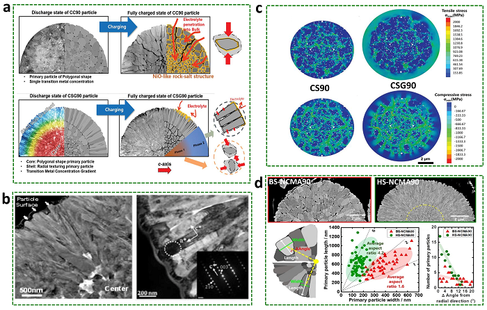 图19. 在浓度梯度正极材料中,特殊的元素梯度分布会诱导一次颗粒呈现径向排列,有效缓解应力在二次颗粒的晶界处聚集,从而抑制晶间裂纹的产生。