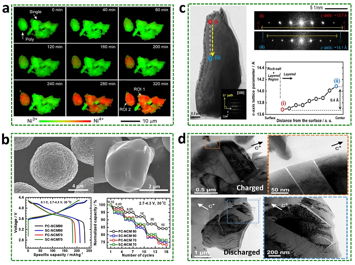 高镍正极材料的循环性和热稳定性在很大程度上取决于其表面化学性质和结构稳定性。在充电态下,高活性Ni4+容易与电解液发生化学副反应,促使电解液分解产生气体产物和CEI相。同时高镍正极材料表面发生化学退化,转变为电化学惰性的NiO岩盐相,极大地阻碍了Li+的传输。同时,充电态下材料表面晶格O释放在电解液存在下容易触发热失控,引起安全隐患。另一方面,正极材料的机械失效会加剧高镍正极材料的表面化学退化。在循环过程中,各向异性的晶格体积变化会产生晶间微裂纹,促进电解液不断沿着晶界向二次颗粒内部渗透,加剧了内部初级颗粒的化学副反应。微裂纹和表面结构退化显著增加电极阻抗,阻碍Li+扩散和电子输运,从而导致容量衰减。