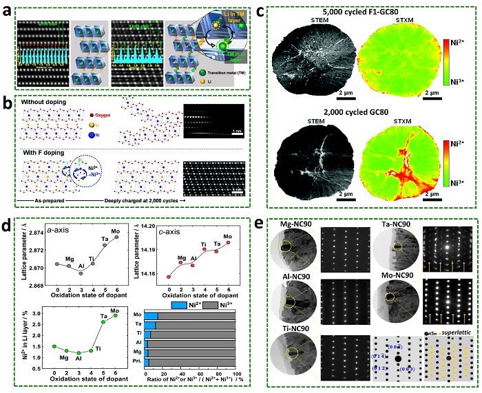 图22. 离子掺杂诱导Li+/Ni2+有序排列的表面超晶格结构:阴离子掺杂诱导;高价态阳离子掺杂诱导。