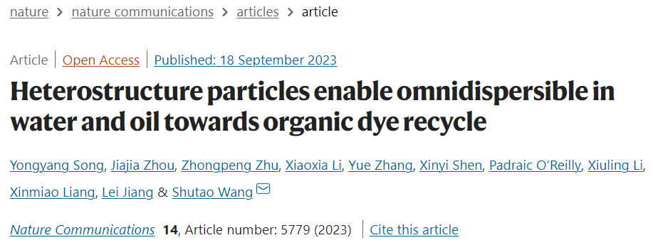 近日,中国科学院理化技术研究所王树涛带领研究团队提出了全新的表面异质纳米结构化颗粒全分散策略,制备了全分散的亲水-疏水异质微球。这些微球在一系列溶剂(水、乙醇、辛烷等)中展示出全分散的优异性能,并实现了从废水中回收有机染料。相关研究成果以Heterostructure particles enable omnidispersible in water and oil towards organic dye recycle为题,发表在Nature Communications上。