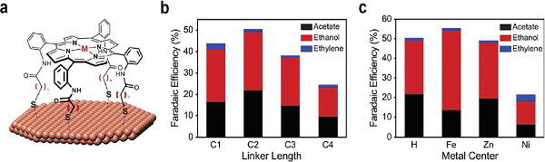 (b-c)不同linker长度和活性中心金属对电化学CO还原形成的C-C产物的法拉第效率的影响。