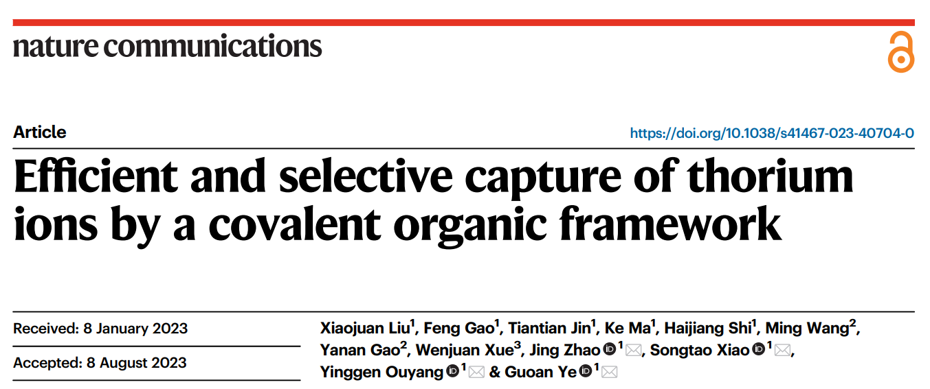 相关研究工作以“Efficient and selective capture of thorium ions by a covalent organic framework”为题发表在国际顶级期刊Nature Communications上。