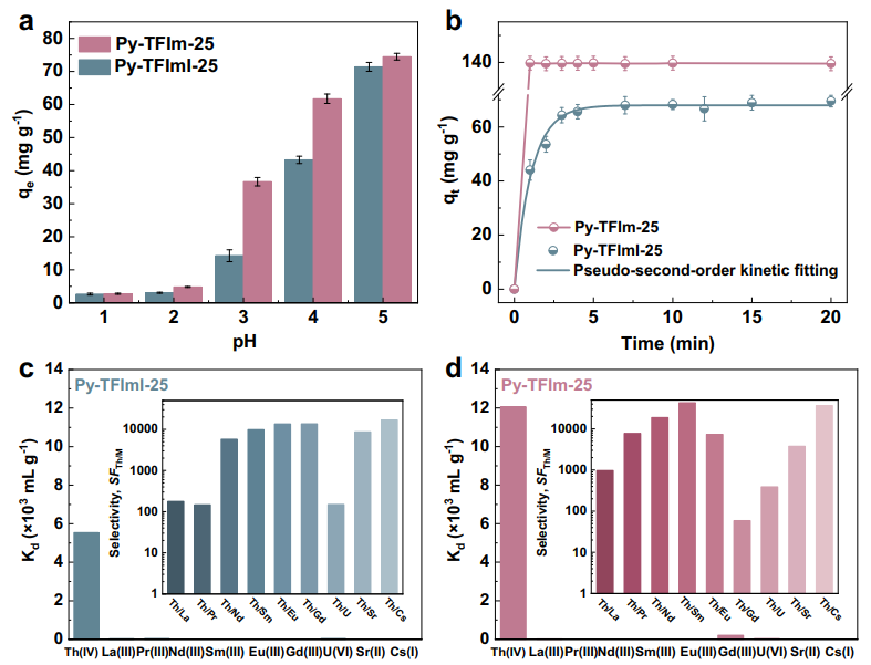 1.作者设计了一种离子COF—Py-TFImI-25 COF,及其去离子类似物Py-TFIm-25 COF,用来更好地理解不同N位点对Th(IV)选择性捕获的作用。两者都对钍具有创纪录的高分离因子,范围在102到105之间。Py-TFIm-25 COF对Th(IV)的吸收能力和吸附速率明显高于Py-TFImI-25 COF,也优于大多数已报道的吸附剂。