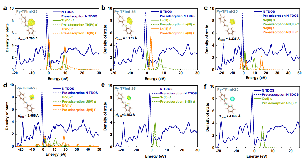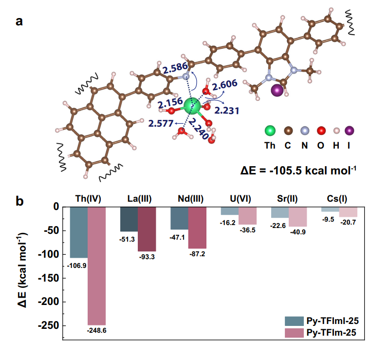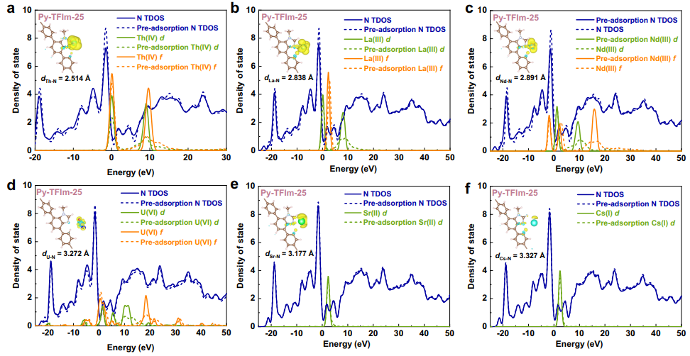 2.Py-TFImI-25 COF和Py-TFIm-25 COF通过Th-N配位相互作选择性捕获钍。本文研究了Th(IV)在不同N位点的优先结合以及选择性配合的机制,对结构与性能之间的关系提供了深入的见解,可以为该领域新型吸附剂的设计提供积极的反馈。